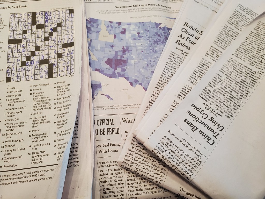 The newspapers pile up,their headlines screamout, sections of business newsor the arts, and a halfcompleted crossword., They sit patiently, knowingmuch has happened that weought to know, but wehave grown tired of deathand so each week we place them in the binwhere they are takento the dump wherethe lessons of the newsgo to die forgotten.