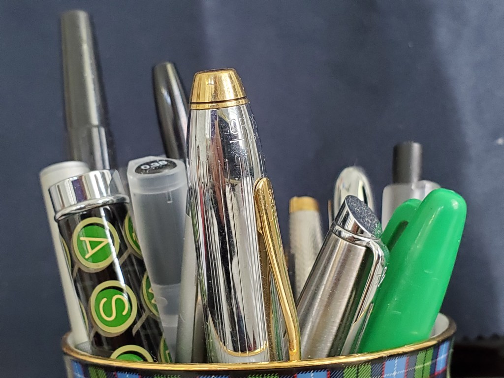He stares at the collectionof pens crammed tightly intoa coffee mug whose handlehad long since broken away. He knows some are dead,awaiting a proper burial,following a brief memorialservice paying homageto their illustrious past. He is certain that oneor more is secretly harboringthe poem or story that hehas been meaning to write,the one that the journalon…